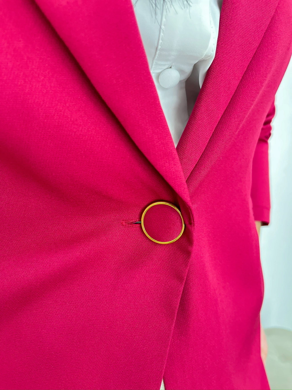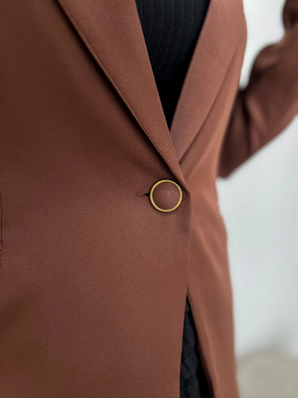 Possui modelagem reta, lapela tradicional e fechamento frontal com botão dourado discreto que acrescenta um toque de charme. A cor terrosa traz versatilidade e combina facilmente com saias, vestidos ou calças, tanto para produções formais quanto casuais com estilo.