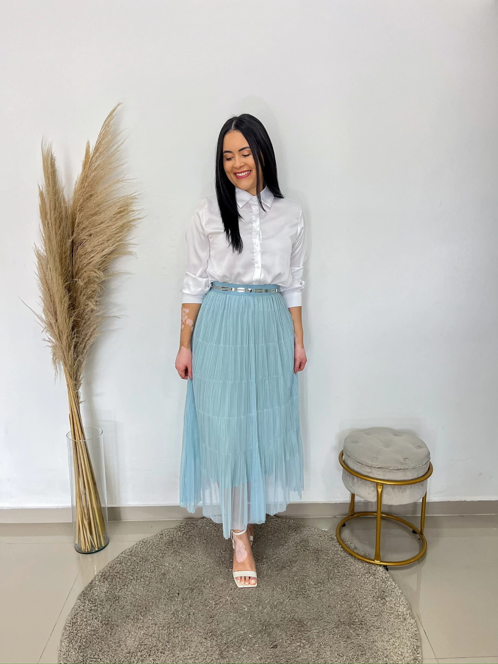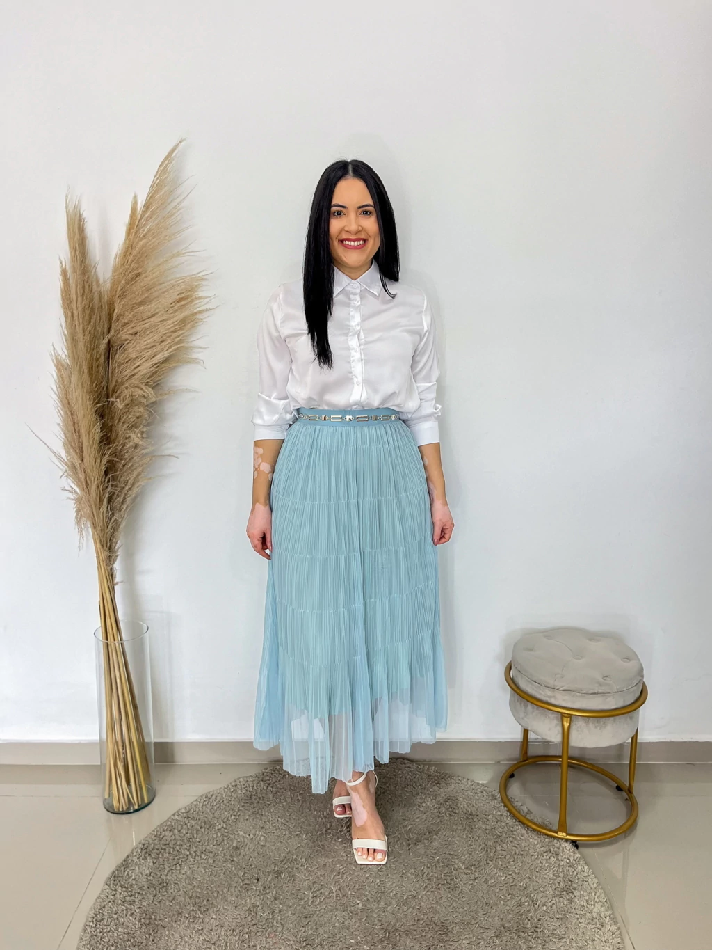 A Saia Alexandra é pura delicadeza e charme! Confeccionada em mousseline plissada, traz um caimento leve e fluido, perfeito para valorizar o movimento com elegância. O comprimento midi alonga a silhueta, enquanto a transparência sutil na barra garante um toque moderno e sofisticado. Uma peça versátil que combina perfeitamente com looks casuais chic ou produções mais refinadas.