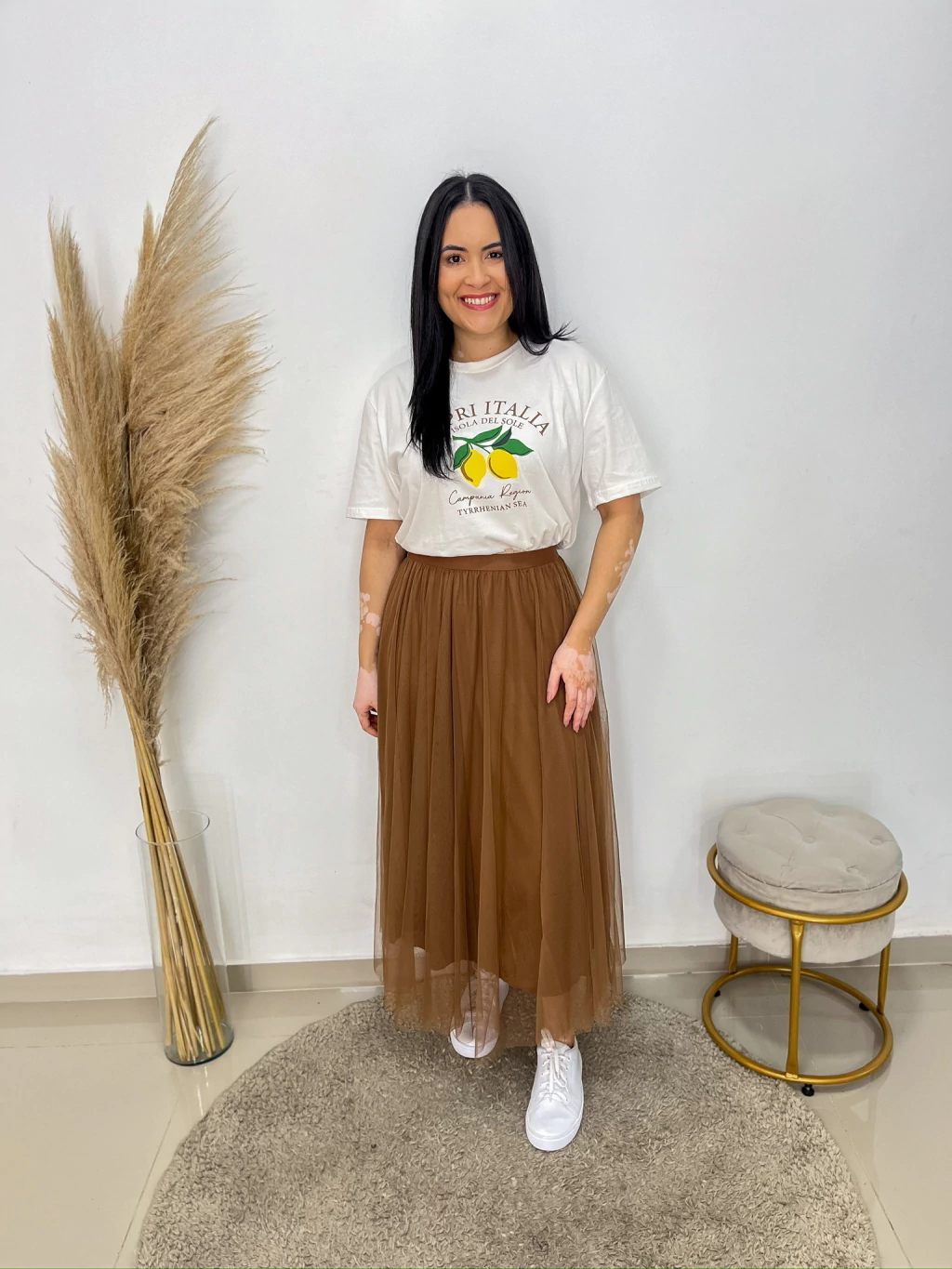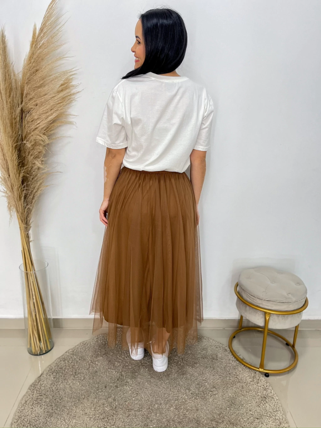 Confeccionada com camada dupla de tule e forro interno, ela oferece conforto e movimento natural ao caminhar. O elástico na cintura garante um ajuste perfeito ao corpo, valorizando a silhueta de forma delicada.