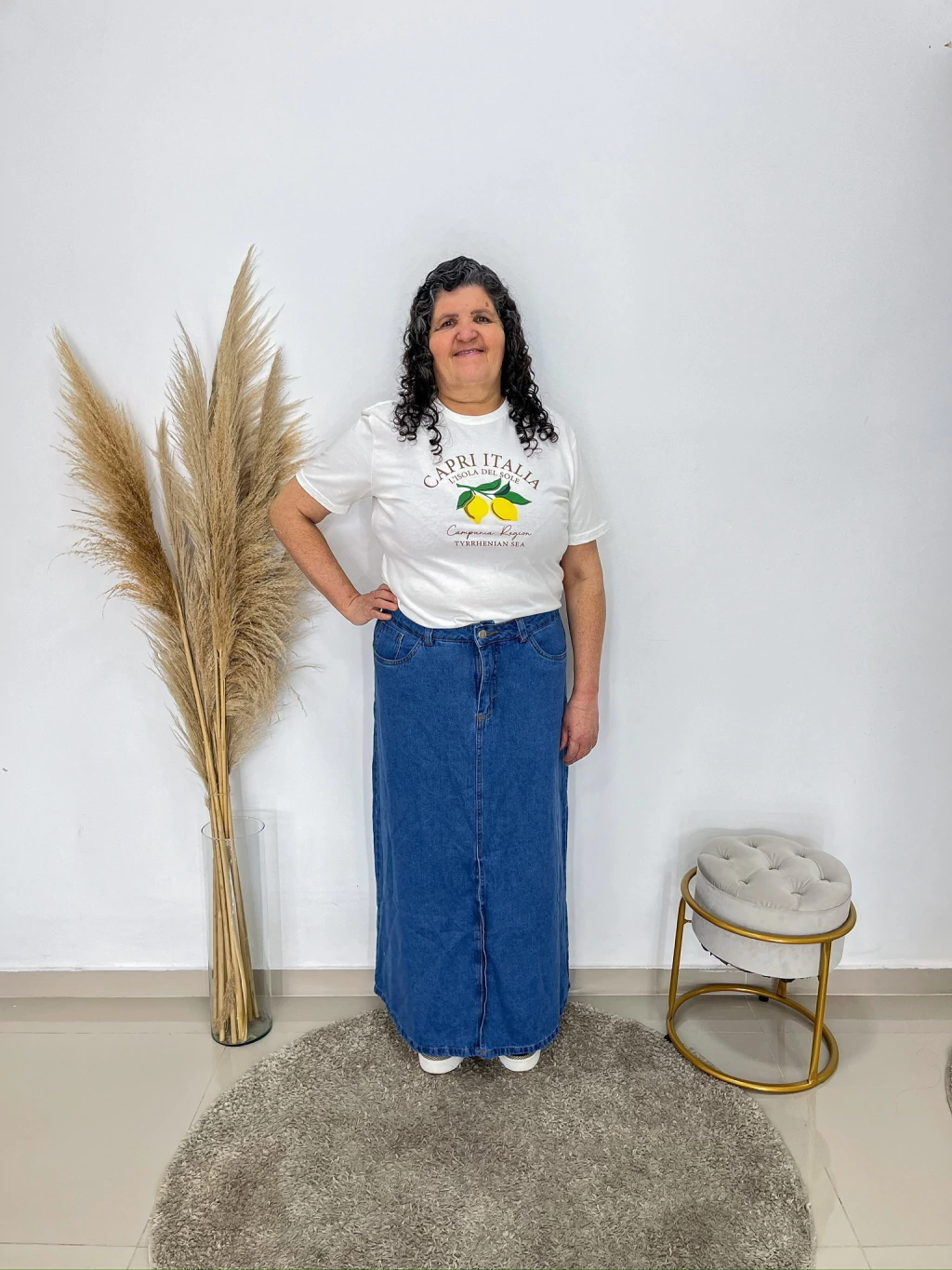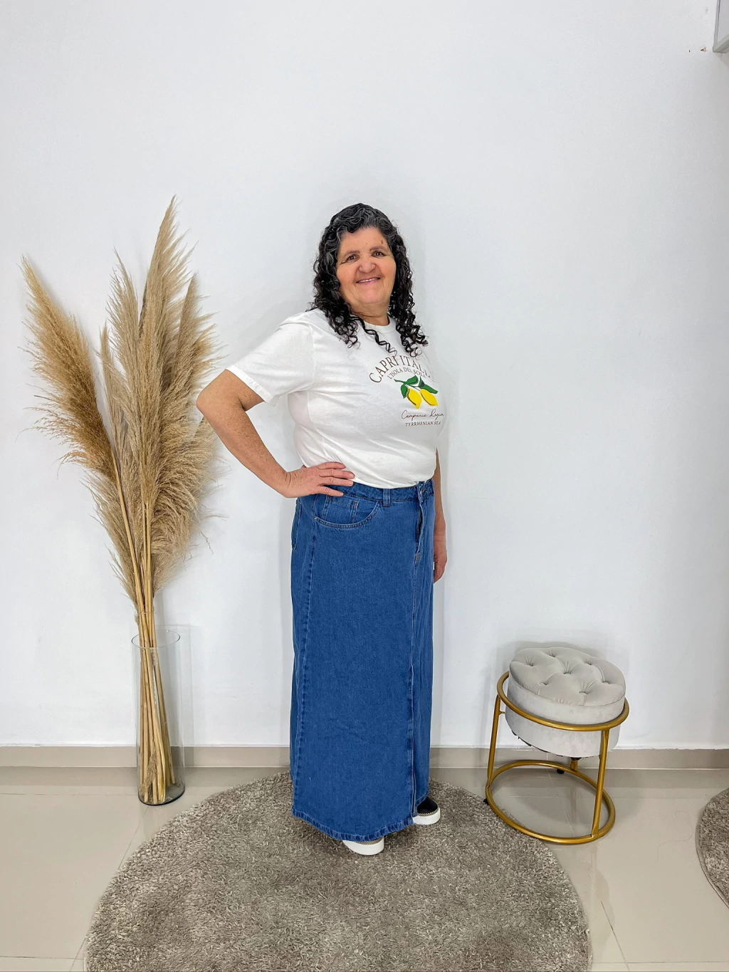 A Saia Grazi é um clássico indispensável no guarda-roupa feminino! Confeccionada em jeans encorpado e de alta qualidade, traz modelagem longa que valoriza a silhueta com muito conforto. O design reto com fenda frontal discreta garante praticidade e liberdade nos movimentos, enquanto os bolsos funcionais deixam a peça ainda mais versátil para o dia a dia.