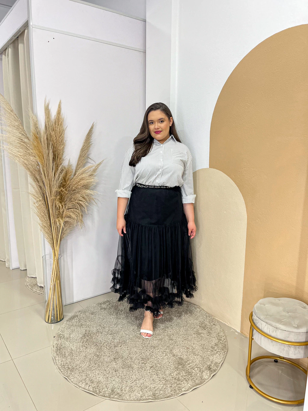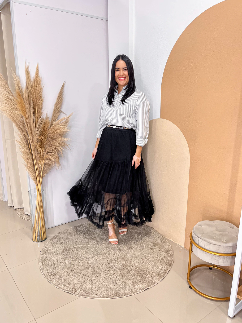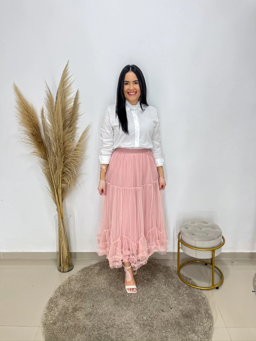 A Saia Sophia é a peça ideal para quem busca um toque de elegância e conforto. Feita em tule, com um delicado forro, essa saia apresenta babados na barra, que garantem um movimento leve e encantador a cada passo.