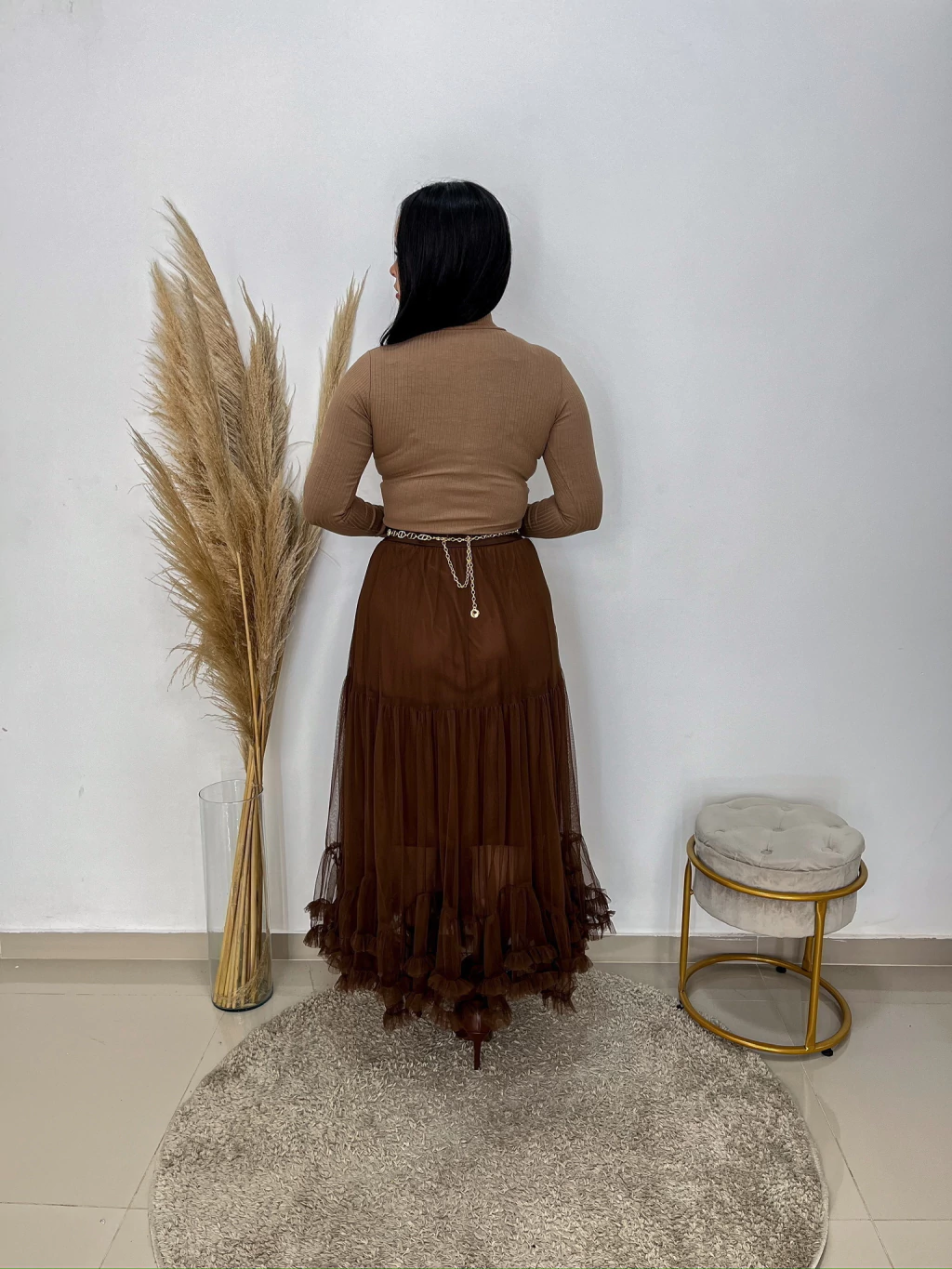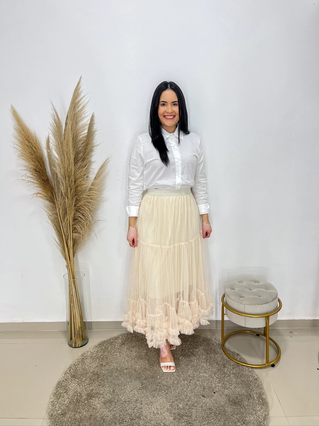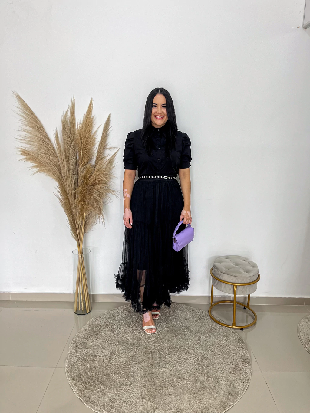 A Saia Sophia é a peça ideal para quem busca um toque de elegância e conforto. Feita em tule, com um delicado forro, essa saia apresenta babados na barra, que garantem um movimento leve e encantador a cada passo.